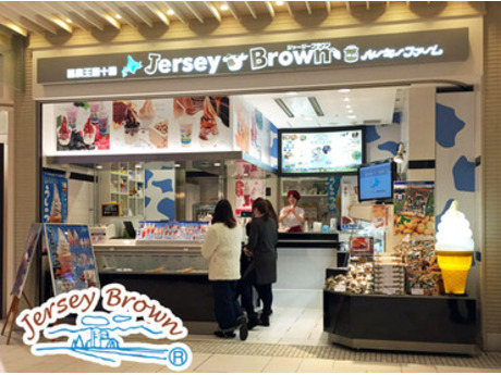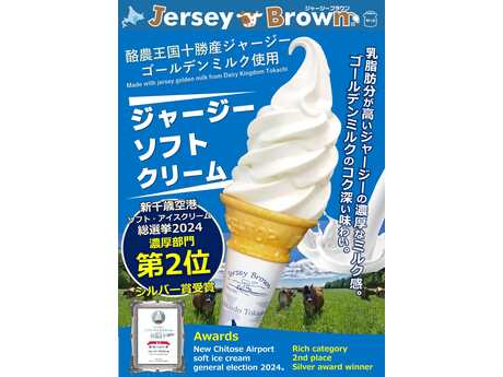 ジャージーブラウンは、濃厚で新鮮な十勝のジャージー牛の生乳で作った乳製品のブランドです。 新千歳空港店では、 ジャージーソフトクリームが大人気!!